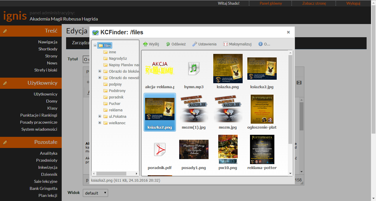 Wgrywanie i łatwe wstawianie obrazków i innych plików do newsów, stron i dowolnych innych miejsc.